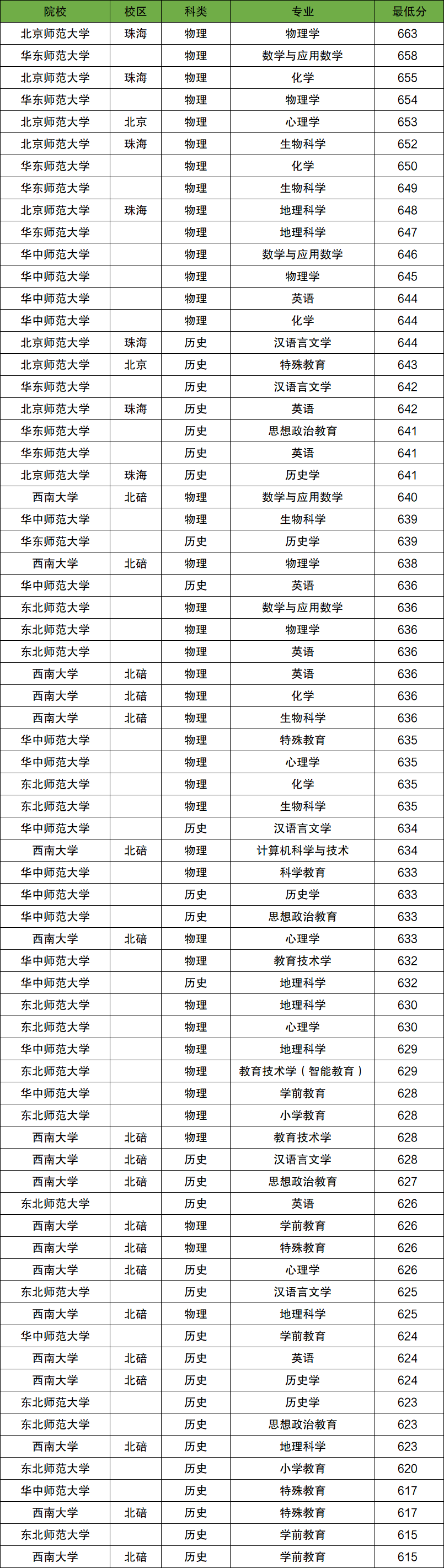 最低分的公费师范生院校及专业是西南大学的学前教育专业,录取分数线为615分。