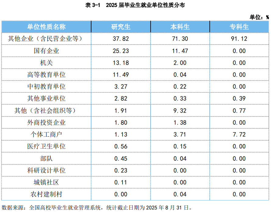 专科生主要去向为:91.12%进入其他企业(含民营企业等),进国企和机关单位的占比均为0%。
