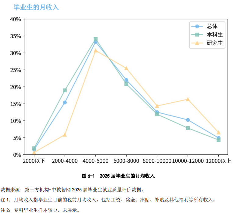 月收入4000-6000元的本科生在35%左右、硕士占30%左右;