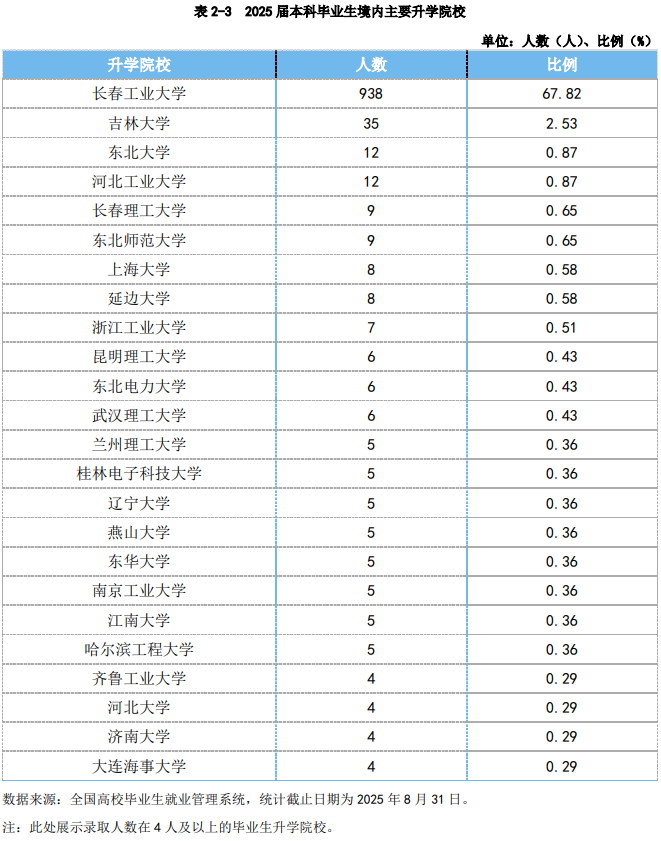 本科生主要升学去向是:本校(938人,占读研人数的67.82%),其次是吉林大学(35人、占比2.53%)。