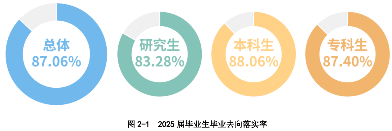 根据《2025届长春工业大学毕业生就业质量年度报告》可知:学校2025届毕业生共有6617人。截至 2025 年 8 月 31 日,毕业生的整体毕业去向落实率为87.06%。其中,毕业研究生的毕业去向落实率为 83.28%,本科毕业生的毕业去向落实率为 88.06%,专科毕业生的毕业去向落实率为 87.40%。