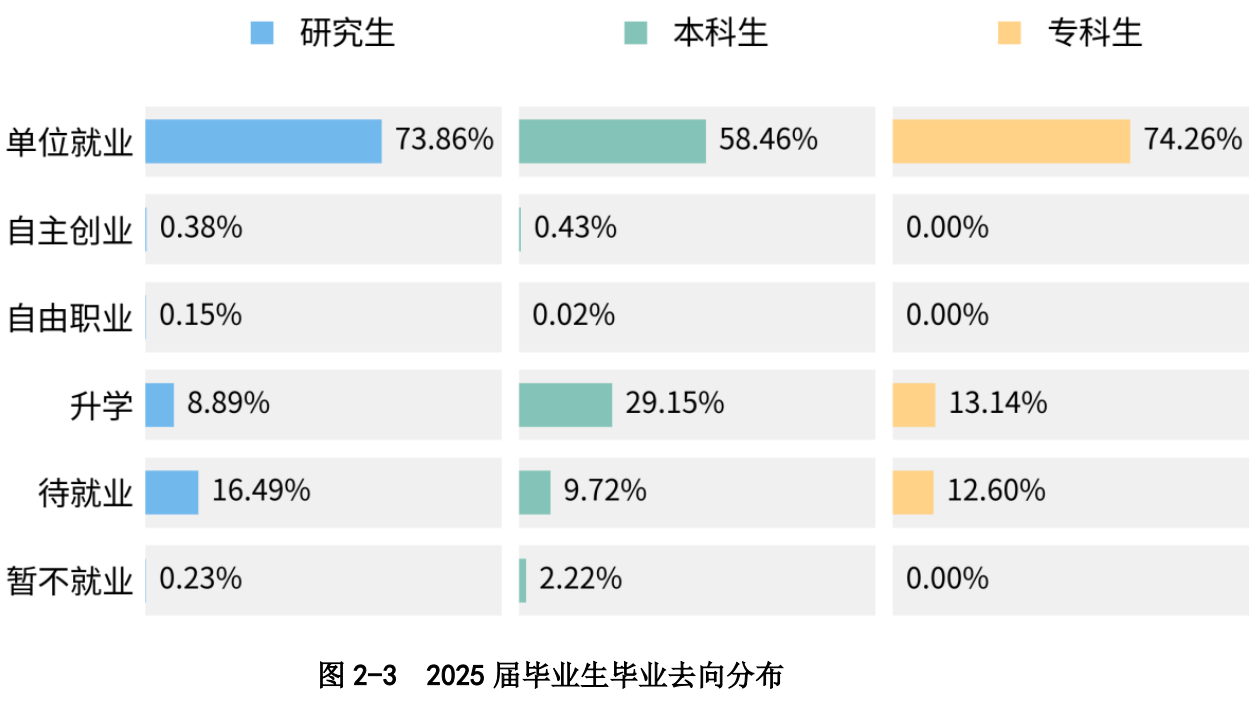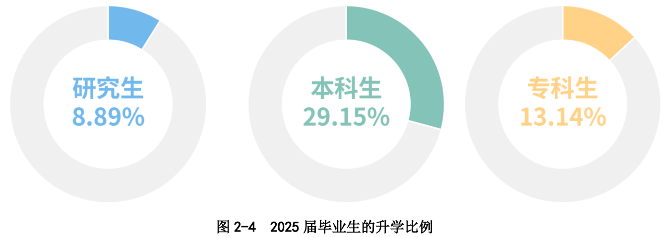看升学情况,13.14%的专科生升入本科、29.15%的本科生继续读研、16.49%的硕士继续读博。