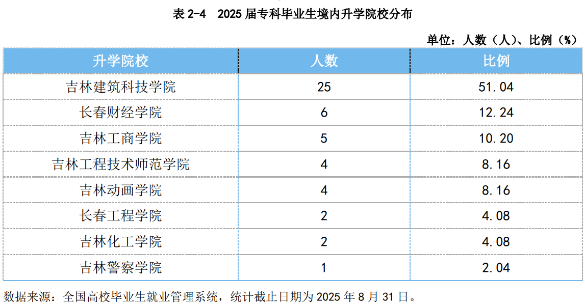 专科生主要升学去向是:吉林建筑科技学院( 25 人,占升本人数的 51.04%)另外,前往长春财经学院、吉林工商学院、吉林工程技术师范学院、吉林动画学院深造的人数较多,分别为 6 人、5 人、4 人、4 人。