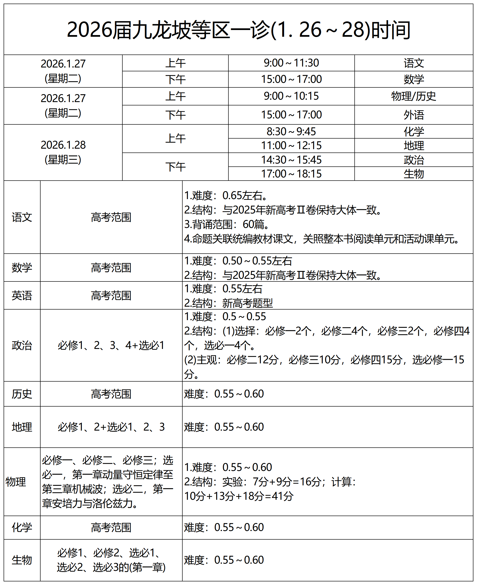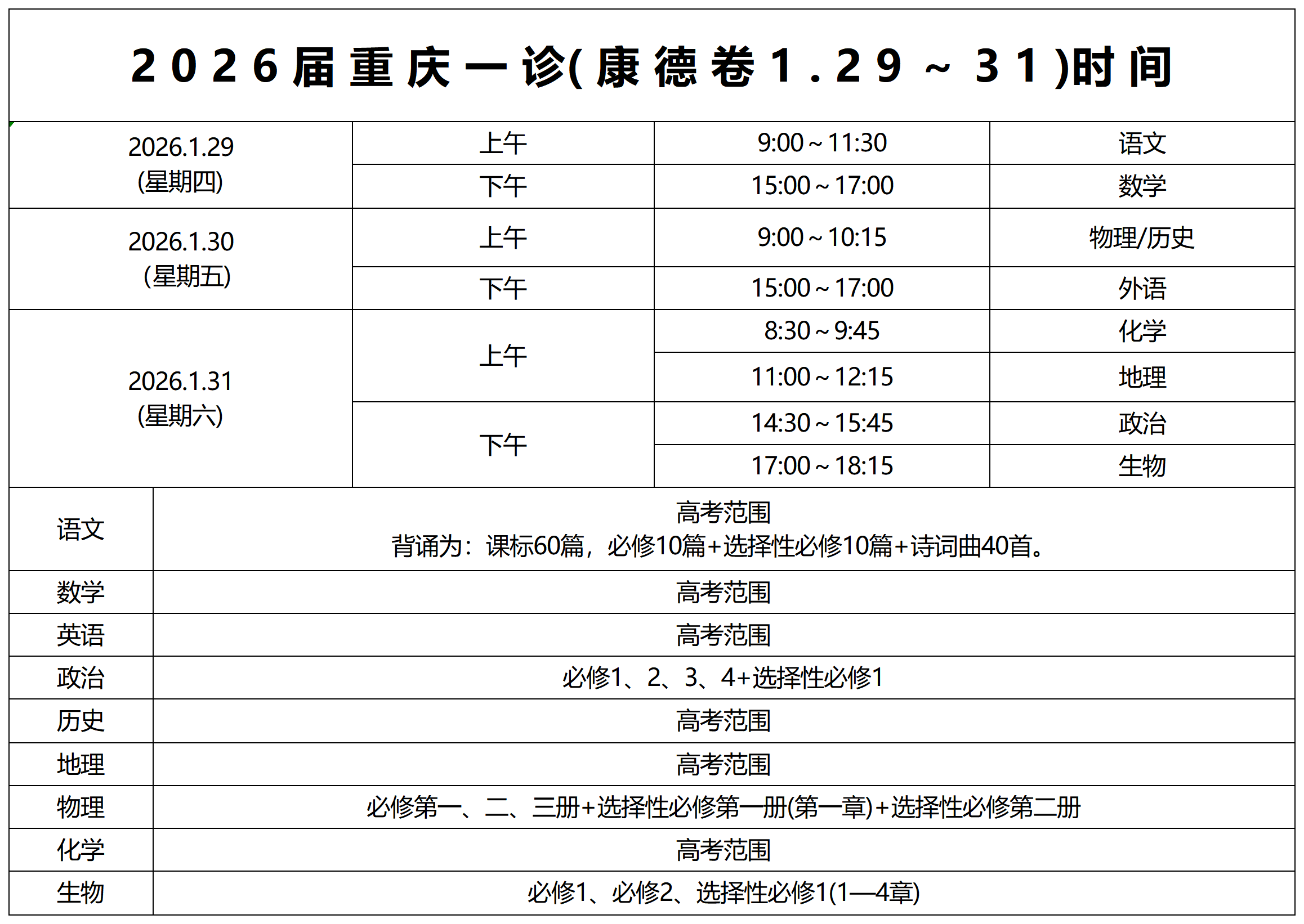 2026重庆一诊分九龙坡卷和康德卷,其中康德一诊考试时间为1月29日-31日,九龙坡一诊考试时间为1月26日-28日。分数线会在考后一周左右公布,届时本文会同步更新。