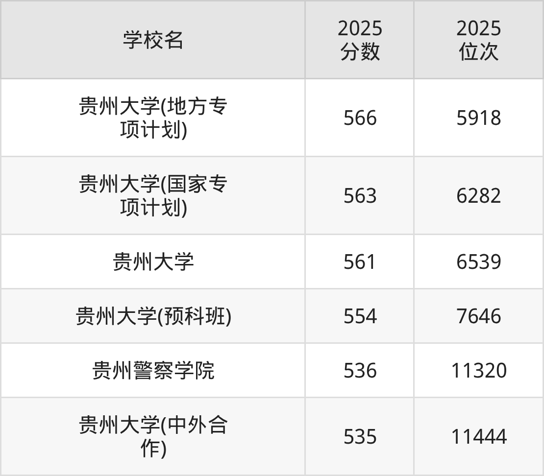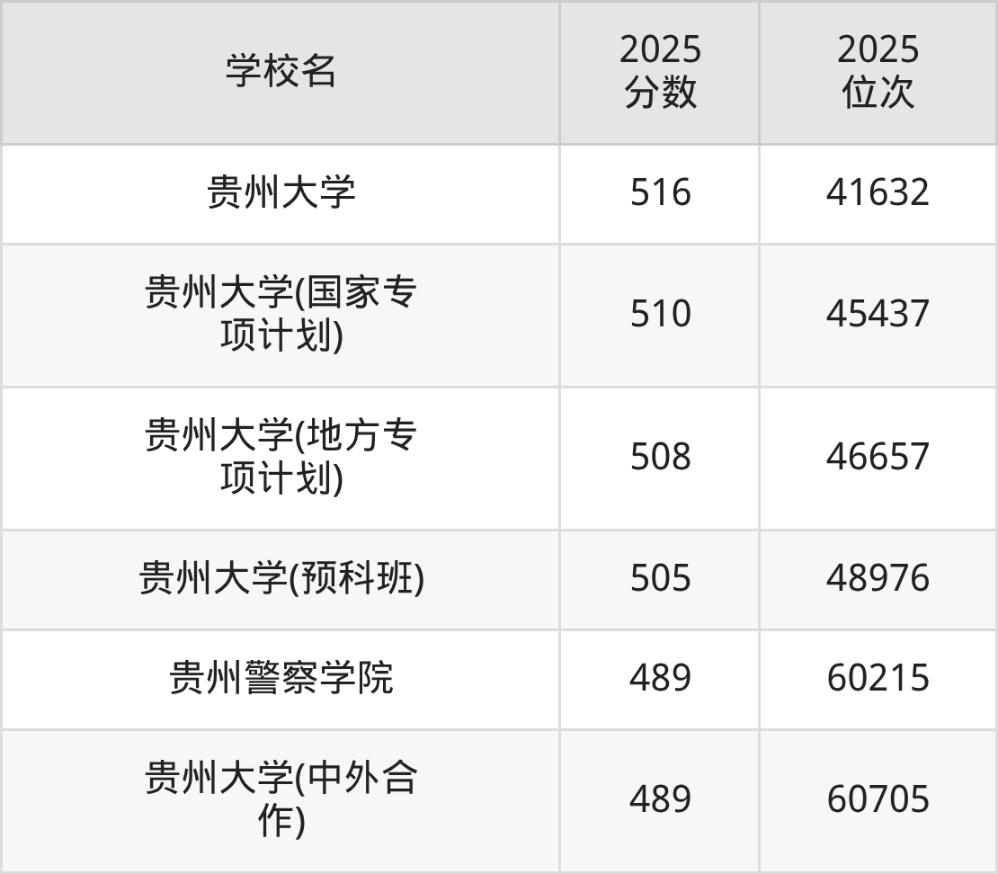 其中,分数线排名第一的一本大学是贵州大学,除此之外,收分较高的院校还有:贵州大学(国家专项计划)510分、贵州大学(地方专项计划)508分、贵州大学(预科班)505分。