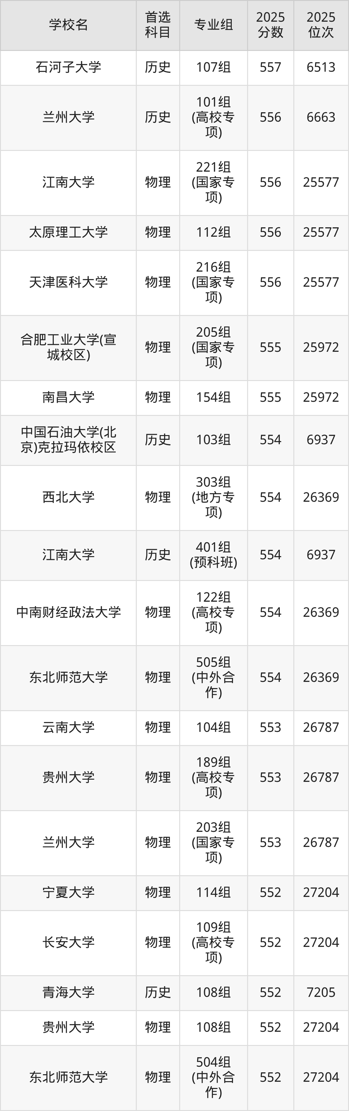 而在非985院校中,值得推荐的非单列专业组有石河子大学(107组557分)、中国石油大学(北京)克拉玛依校区(103组554分)、江南大学(401组(预科班)554分)等,这些均为211大学。