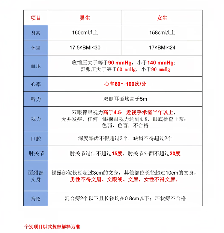 完整检查项目及标准可查看:《应征公民体格检查标准》