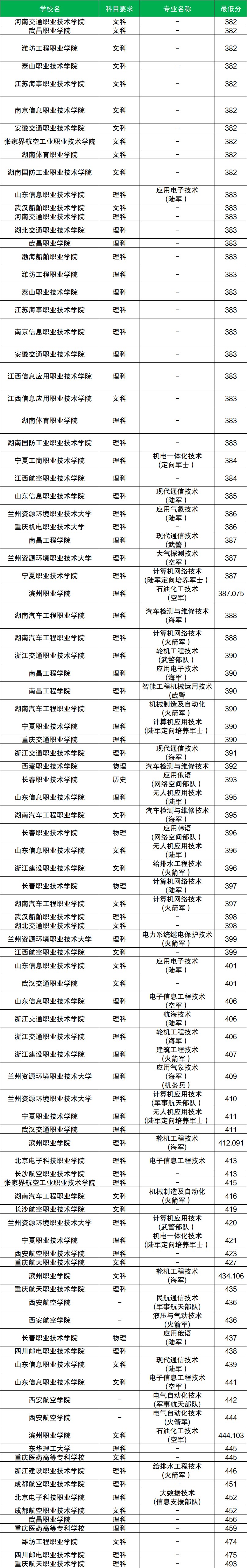 其中物理类分数至少在383分及以上、历史类分数至少在382分及以上才有机会被录取。而物理类分数最低的院校是山东信息职业技术学院、河南交通职业技术学院、湖北交通职业技术学院、武昌职业学院等,历史类分数最低的院校是河南交通职业技术学院、武昌职业学院、潍坊工程职业学院、泰山职业技术学院等。