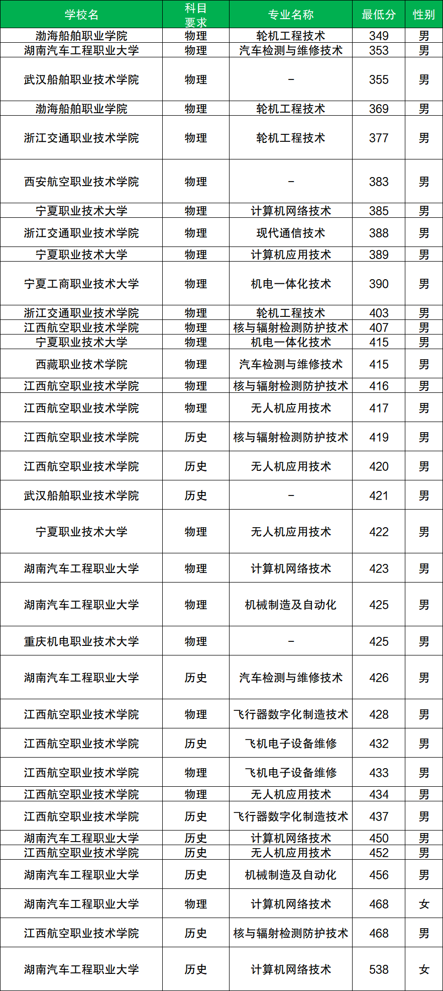 其中物理类男生分数至少在349分及以上、女生分数至少在468分及以上才有机会被录取。而男生分数最低的院校是渤海船舶职业学院,女生分数最低的院校是湖南汽车工程职业大学。