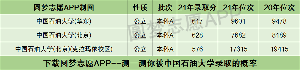 最后,小编也要提醒大家:报考大学时参考大学三年最低位次,只能保证你被中国石油大学录取。但如果你想知晓自己被中国石油大学哪些专业录取的概率比较高的话,那么一定要看自己的高考位次超过了中国石油大学哪些专业三年的位次!(手机应用市场下载圆梦志愿APP,可查看全国所有大学及专业近三年的录取分数线和位次,测一测你被目标大学录取的概率是多少!)