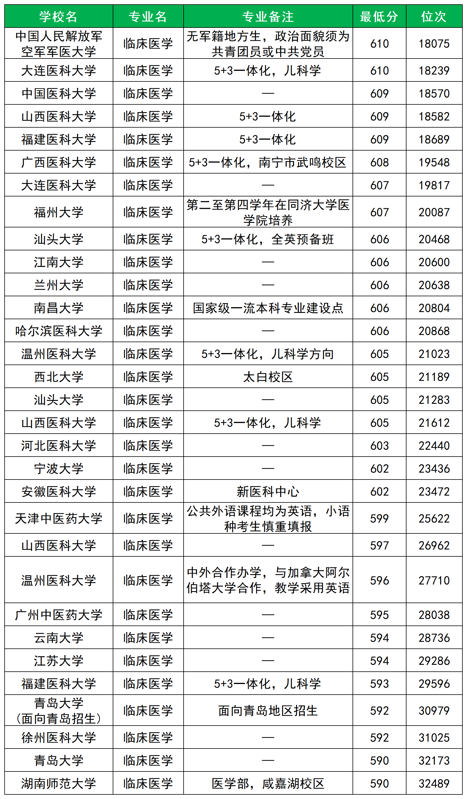 其中空军军医大学、大连医科大学分数线最高,为610分;其次为中国医科大学、山西医科大学、福建医科大学,609分;最低为湖北师范大学、青岛大学,590分。整体上,600分左右能报考的临床医学专业还是不少的。