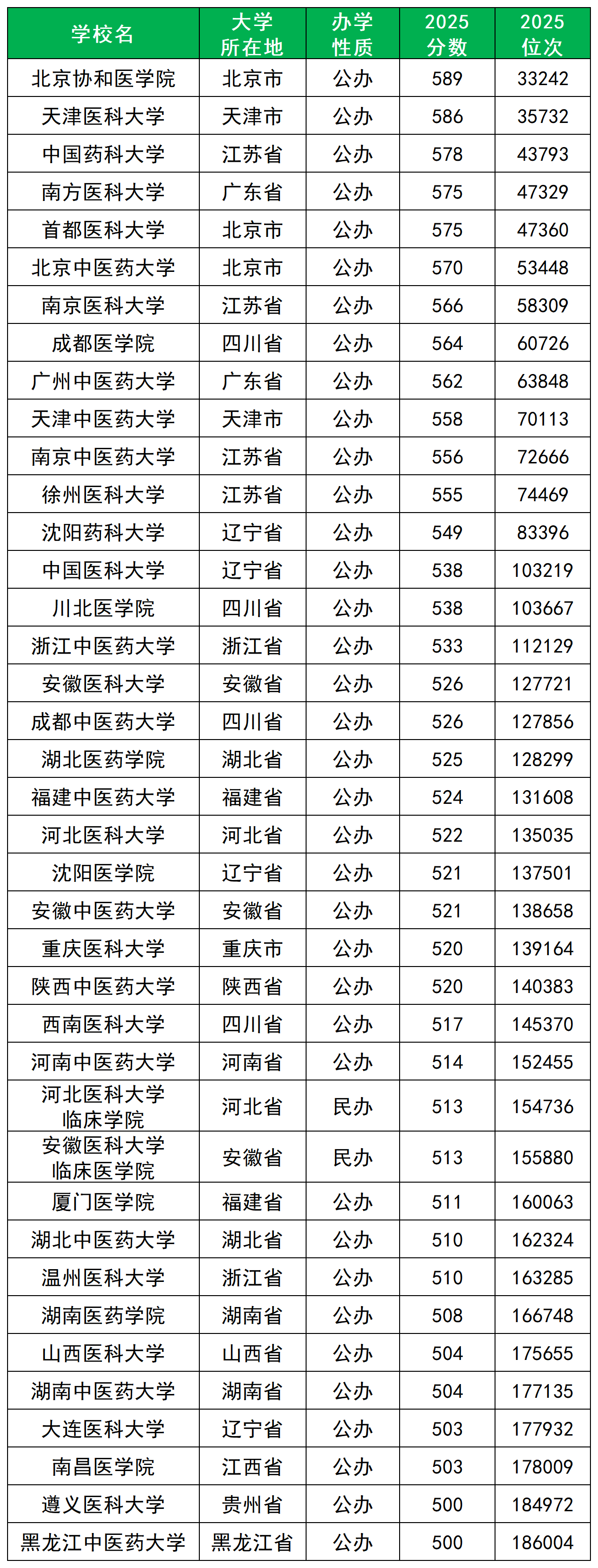 其中分数最高为北京协和医学院(589分),其次为天津医科大学(586分);最低为黑龙江中医药大学与遵义医科大学(500分),其次为南昌医学院与大连医科大学(503分)。
