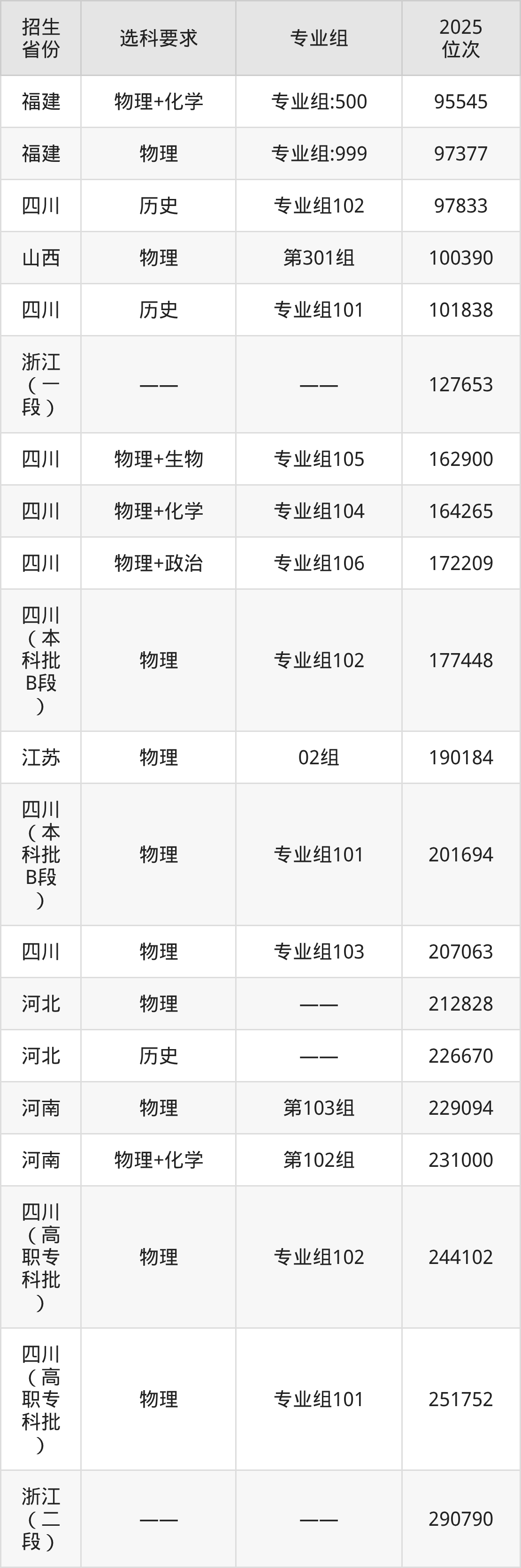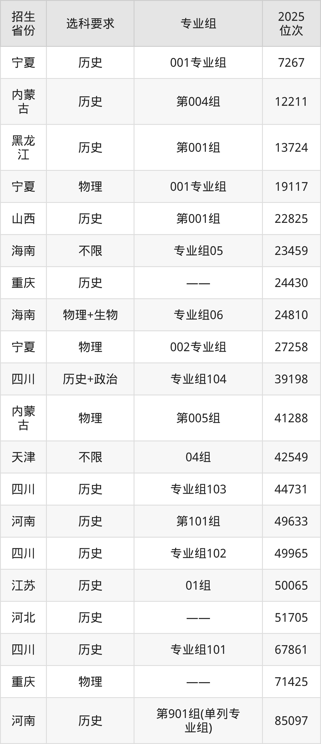 成都文理学院2025年在全国各省的位次差异较大,最高位次是7267位(宁夏历史类)、最低位次是360375位(河北物理类)。各省具体位次请看下图: