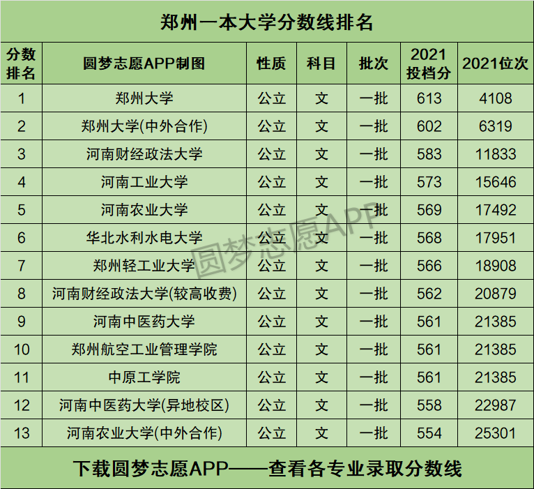 根据河南省招生办公室公布的数据,圆梦志愿为大家整理了郑州市内所有一本大学2021年在郑州文科的投档分数线排名汇总表。其中,郑州大学在文科的投档分数线最高,其2021年的投档分为613分、最低位次为4108名。