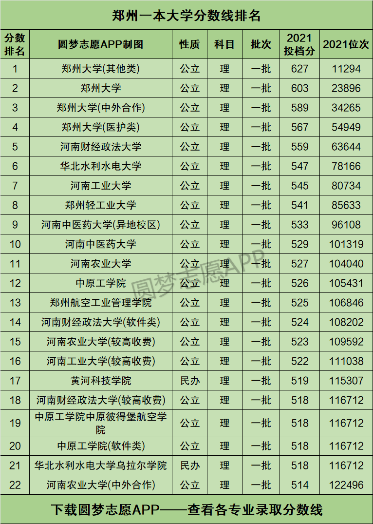 根据河南省招生办公室公布的数据,圆梦志愿为大家整理了郑州市内所有一本大学2021年在郑州理科的投档分数线排名汇总表。其中,郑州大学(其他类)在理科的投档分数线最高,2021年的最低分为627分、最低位次为11294名。