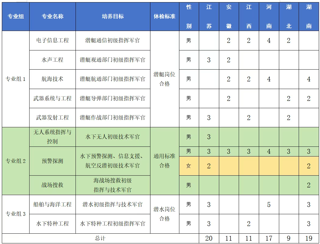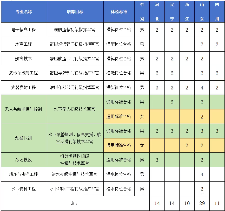 海军潜艇学院面向全国各省(市、自治区)招收普通高中毕业生165名,其中男生155名,女生10名。