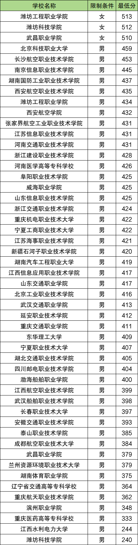分数线较低的士官学校有武昌职业学院(女510分)、潍坊科技学院(男240分)、江西水利电力大学(男244分)、重庆医药高等专科学校(男333分)等。