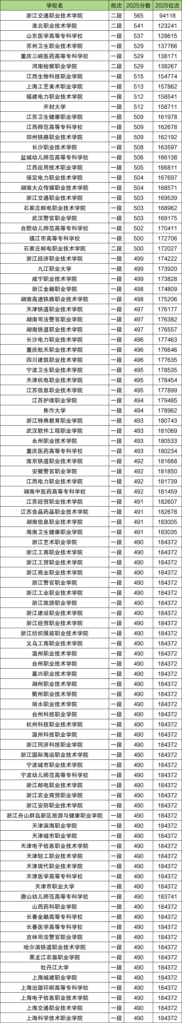 录取分数线最高的是浙江交通职业技术学院,2025年最低分565分,超二段线297分,招生门槛非常高。