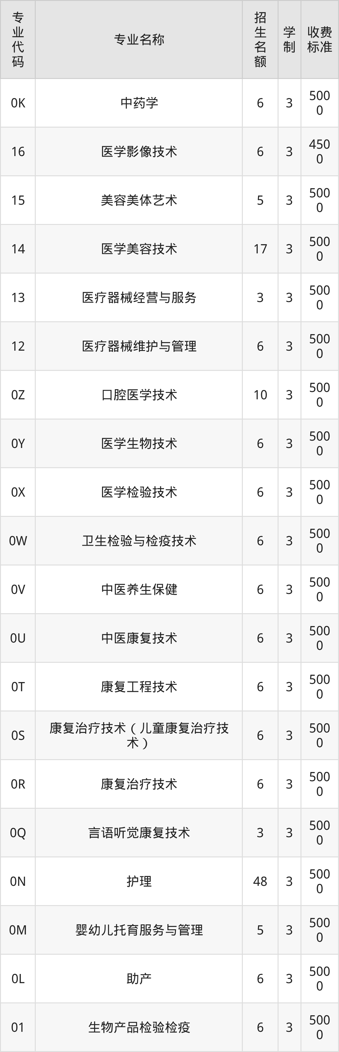 | 专业 代码 | 专业名称 | 招生 名额 | 学 制 | 收费 标准 |