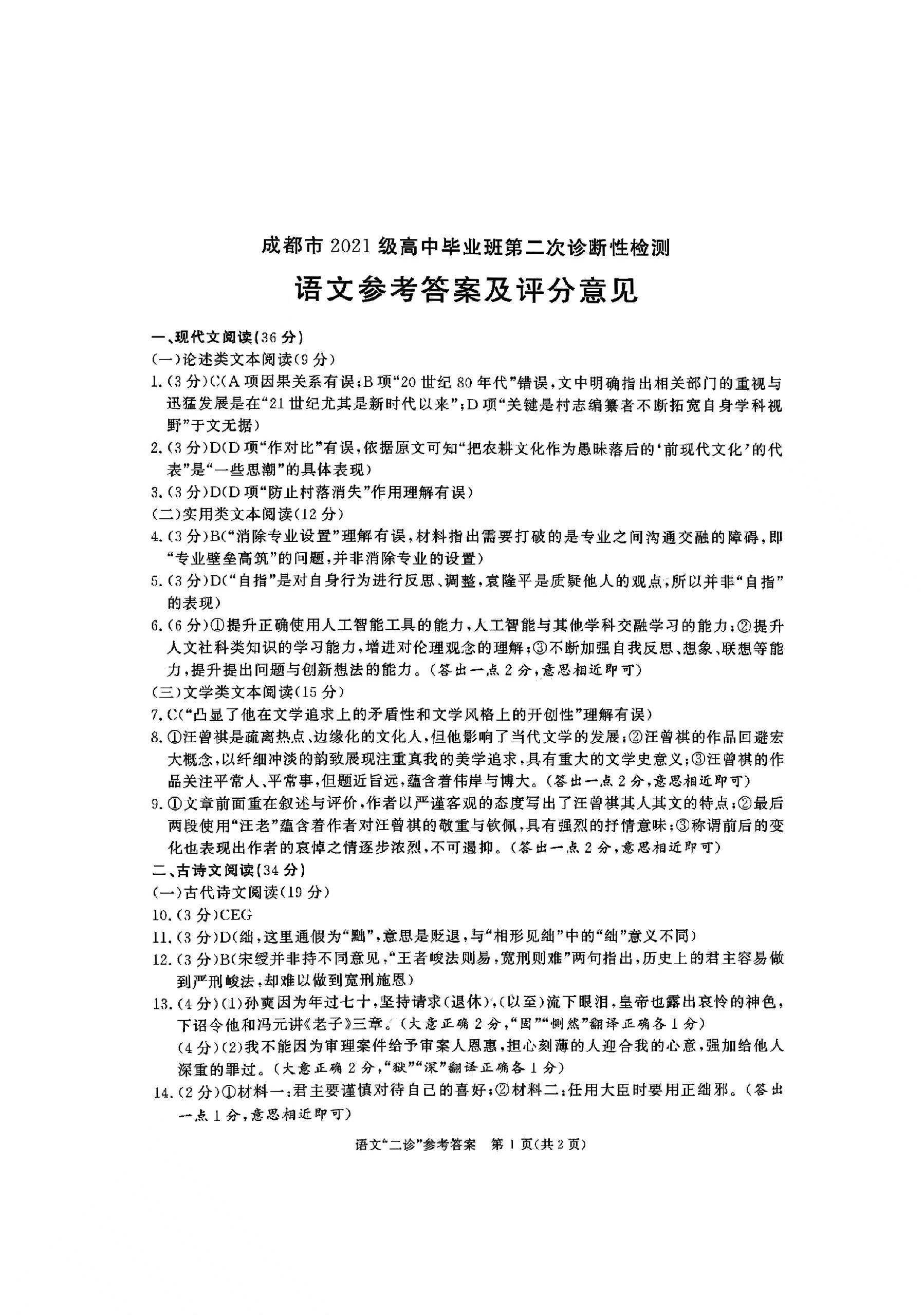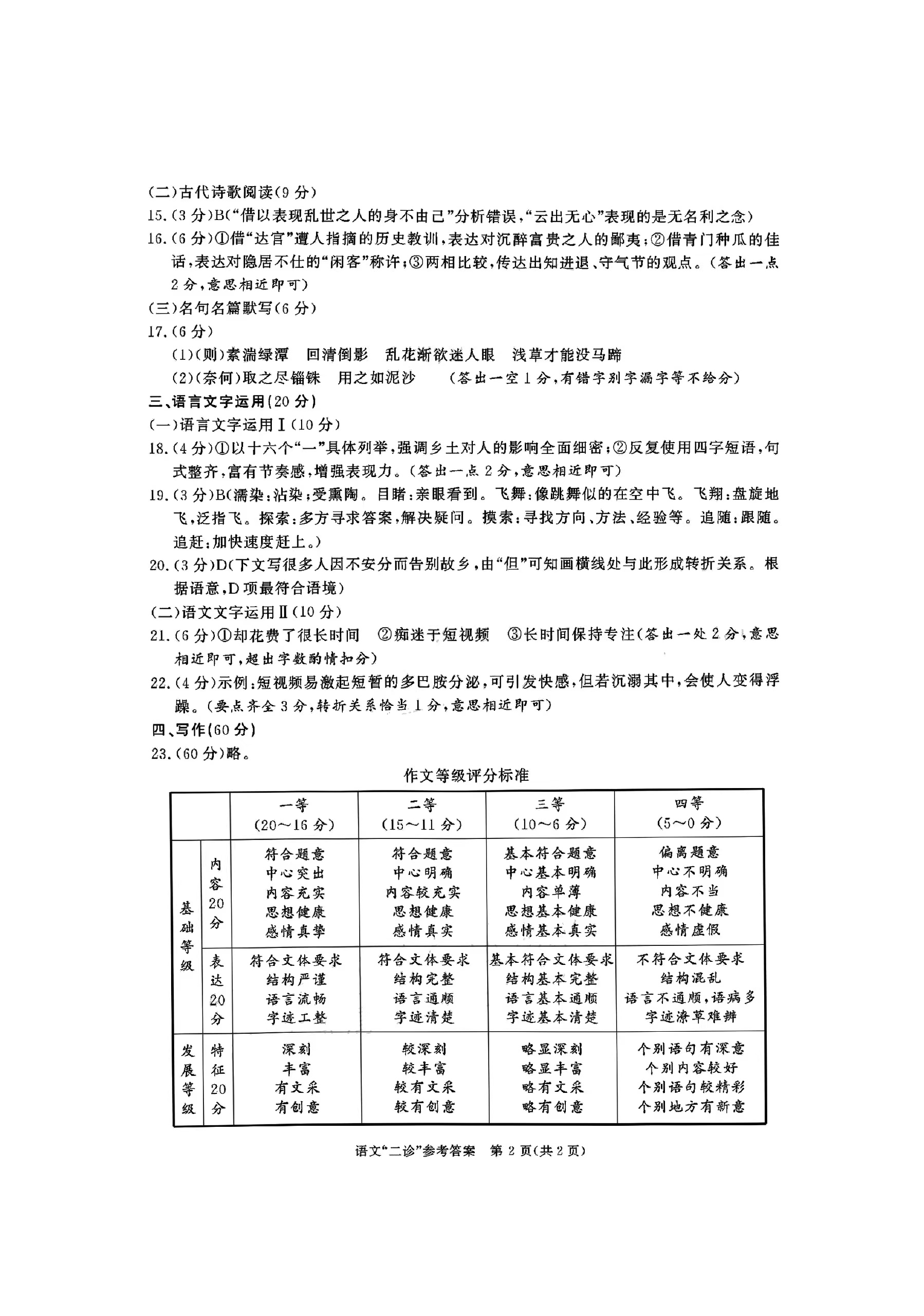 1、成都二诊语文答案及试卷