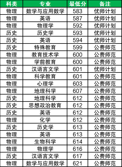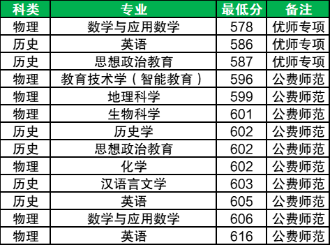 物理类最低分600分、对应最低分专业是教育技术学和学前教育。