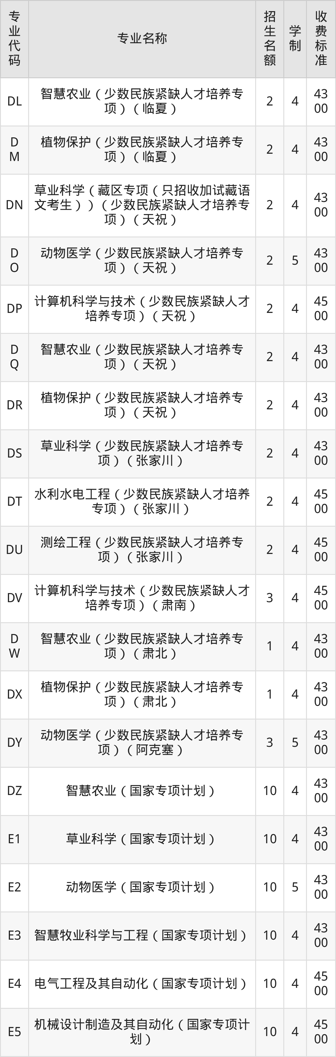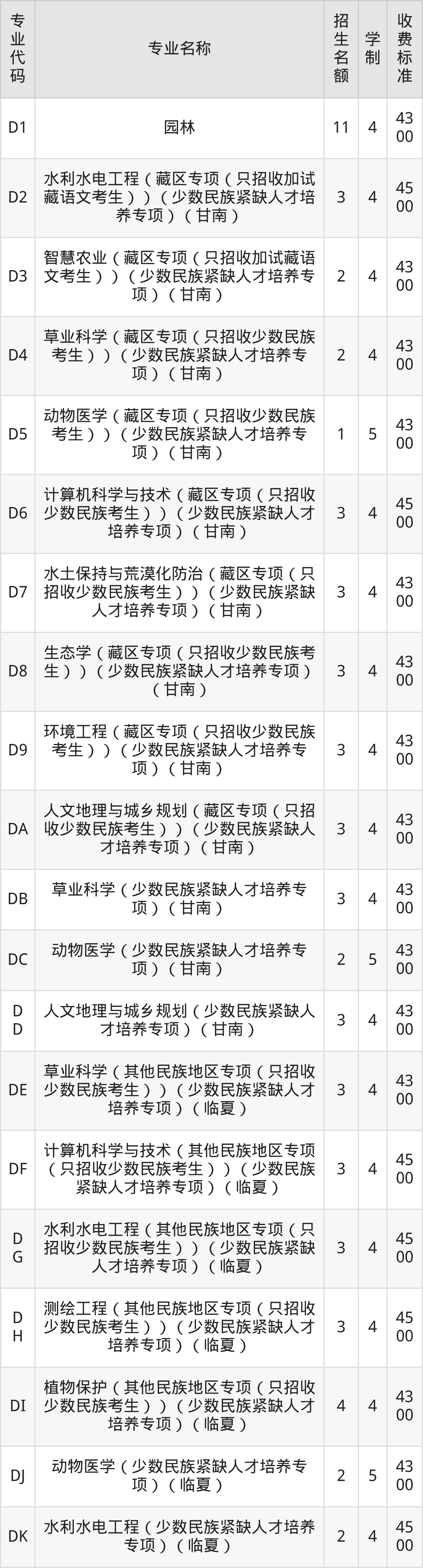 甘肃农业大学草业科学专业(藏区专项(不区分民族成分)),甘肃农业大学动物医学专业(藏区专项(不区分民族成分)),甘肃农业大学人文地理与城乡规划专业(藏区专项(不区分民族成分))。