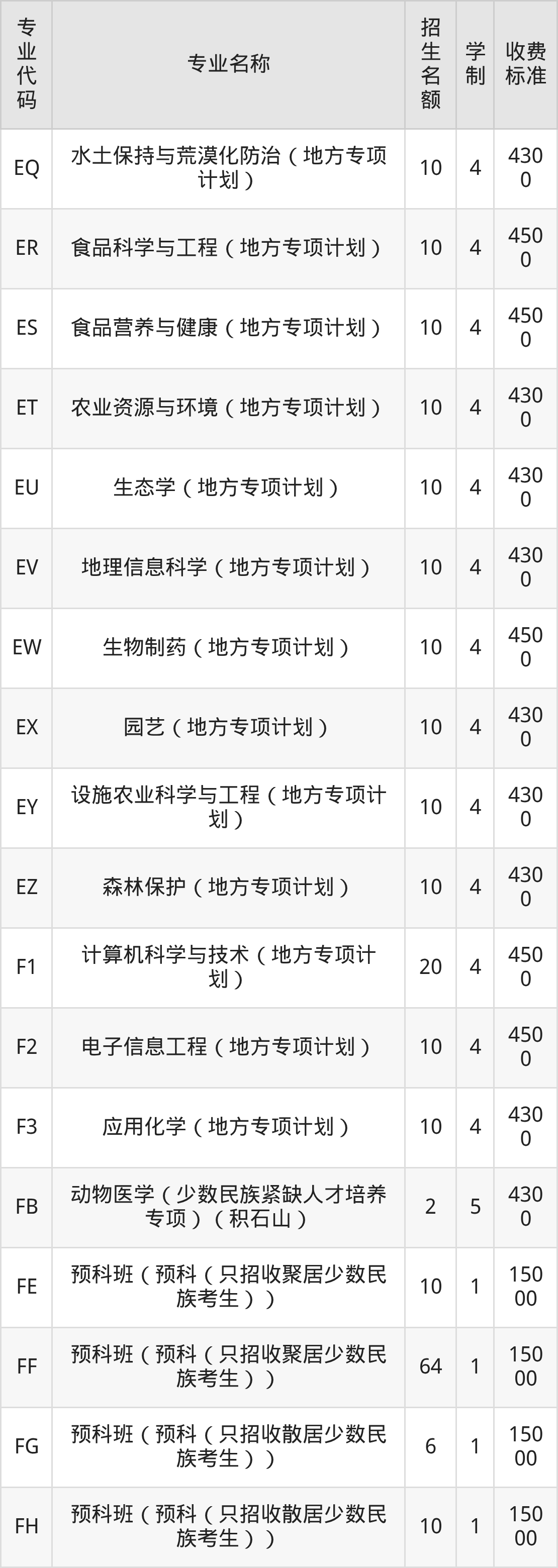 | AG | 农林经济管理(藏区专项(只招收加试藏语文考生))(少数民族紧缺人才培养专项)(甘南) | 2 | 4 | 4300 |
