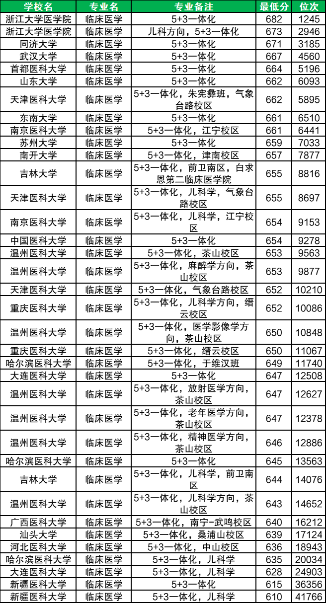 上述为2025年临床医学专业大学实力排名,结合浙江最新一年录取数据,临床医学5+3最低录取分数线为610分、八年制最低录取分数线为675分,2026届可在下文查阅具体院校分数。