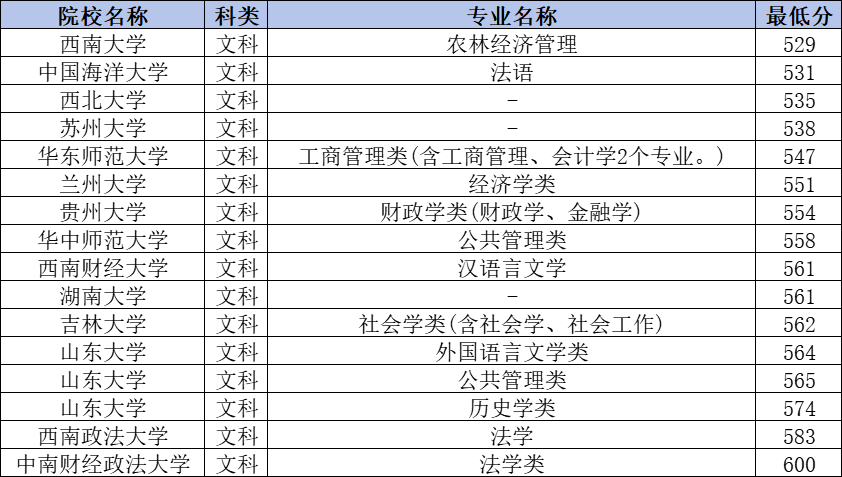 文科最低分为529分,对应院校为西南大学,这也是文科考生最容易上的大学,适合低分同学报考。