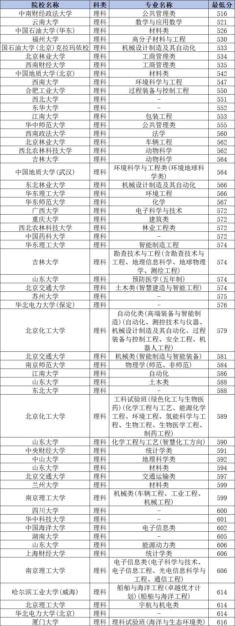 理科最低分为516分,对应院校为中南财经政法大学,这也是理科考生最容易上的大学,适合低分同学报考。