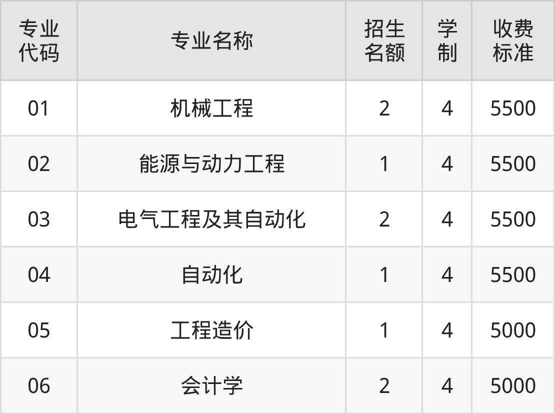 | 专业 代码 | 专业名称 | 招生 名额 | 学 制 | 收费 标准 |