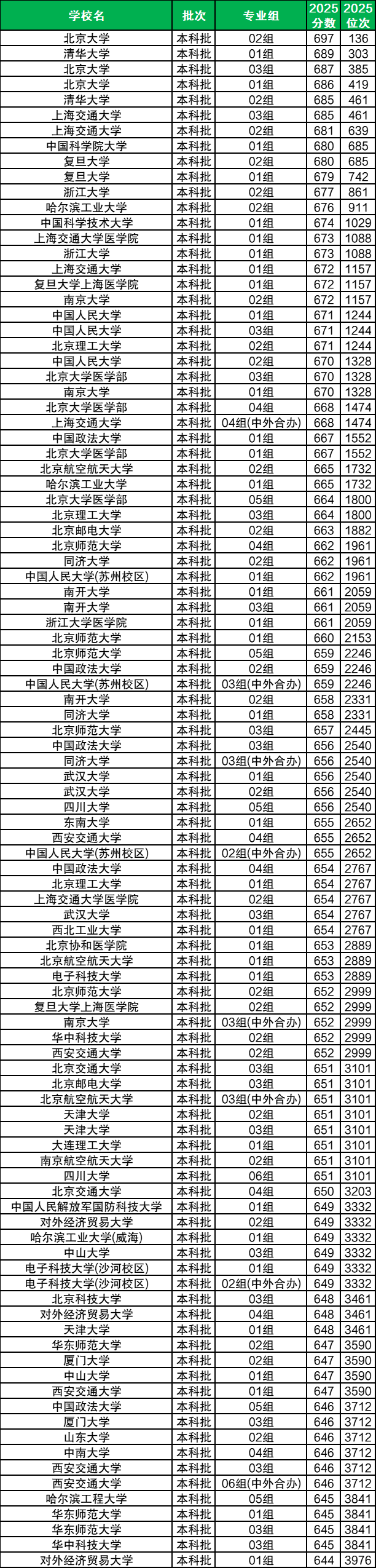 下面附上全国大学2025年在北京录取分数线Top100一览表,分数表较长,需滑动查阅: