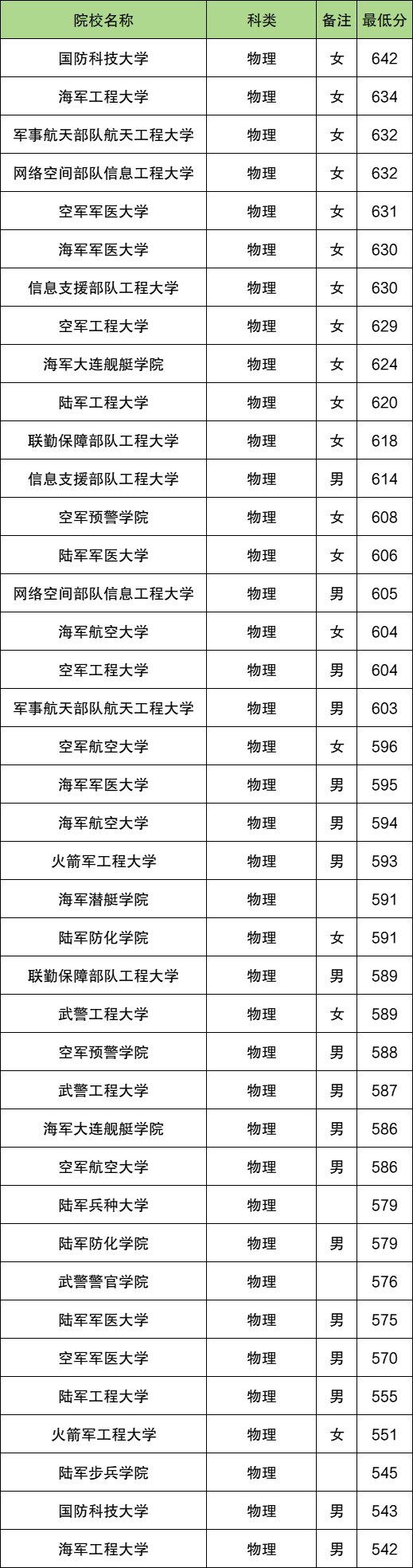 在物理组招生的军校一共有22所,下面是各军事院校录取最低分情况,含男生女生最低分。