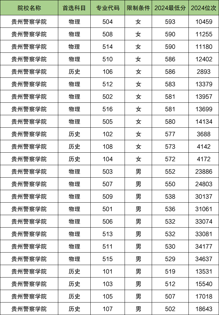 贵州警察学院,2025年女生投档最低582分。