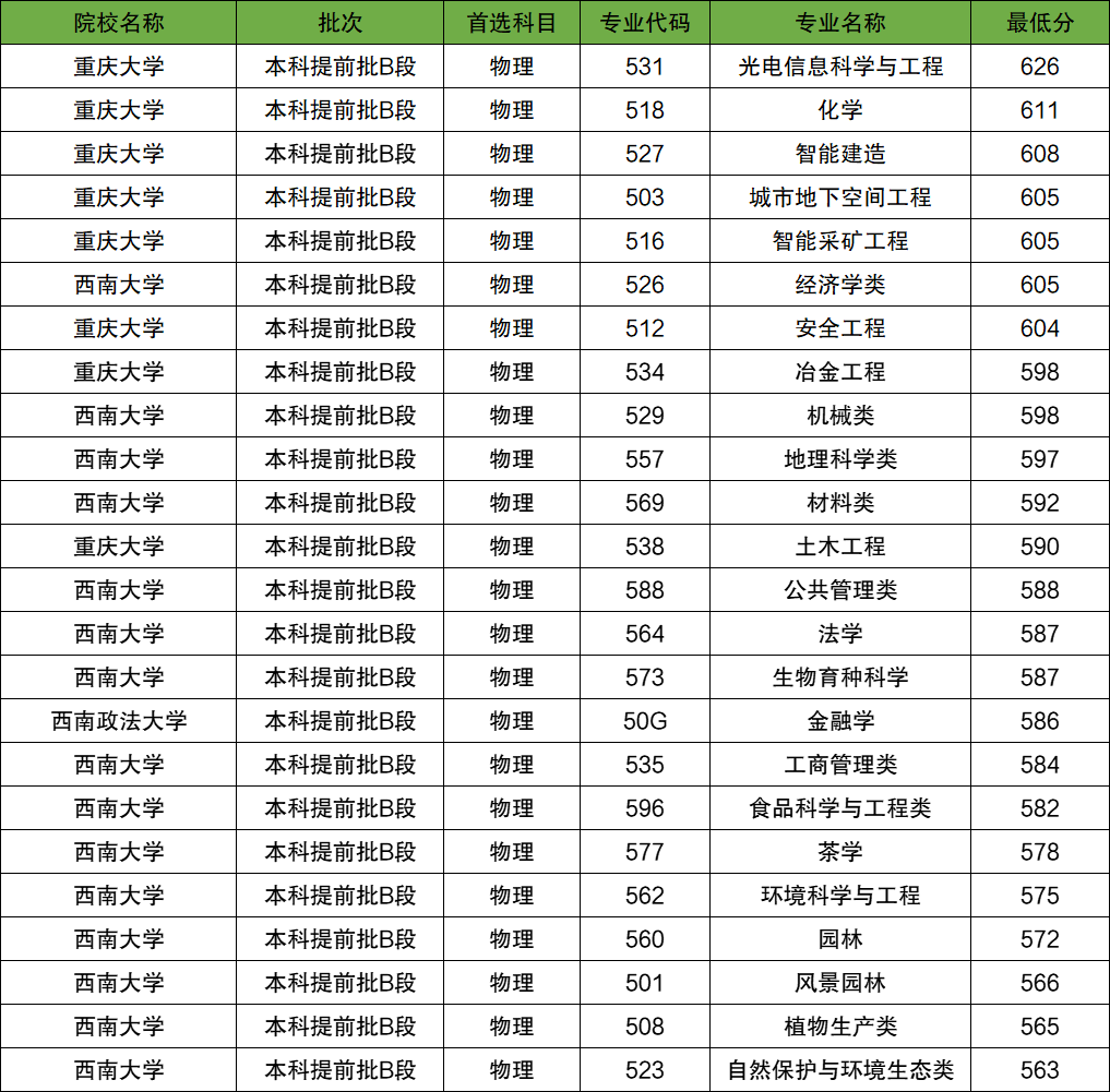 分数最高的是重庆大学光电信息科学与工程,需要626分;分数最低的是西南大学自然保护与环境生态类,需要563分。