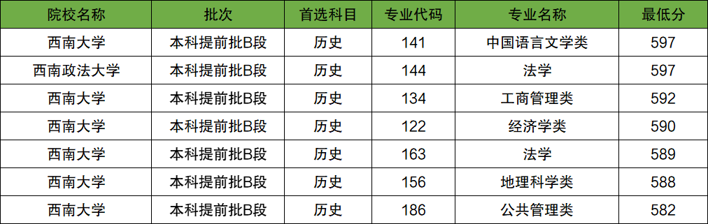 分数最高的是西南大学中国语言文学类,需要597分;分数最低的是西南大学公共管理类,需要582分。