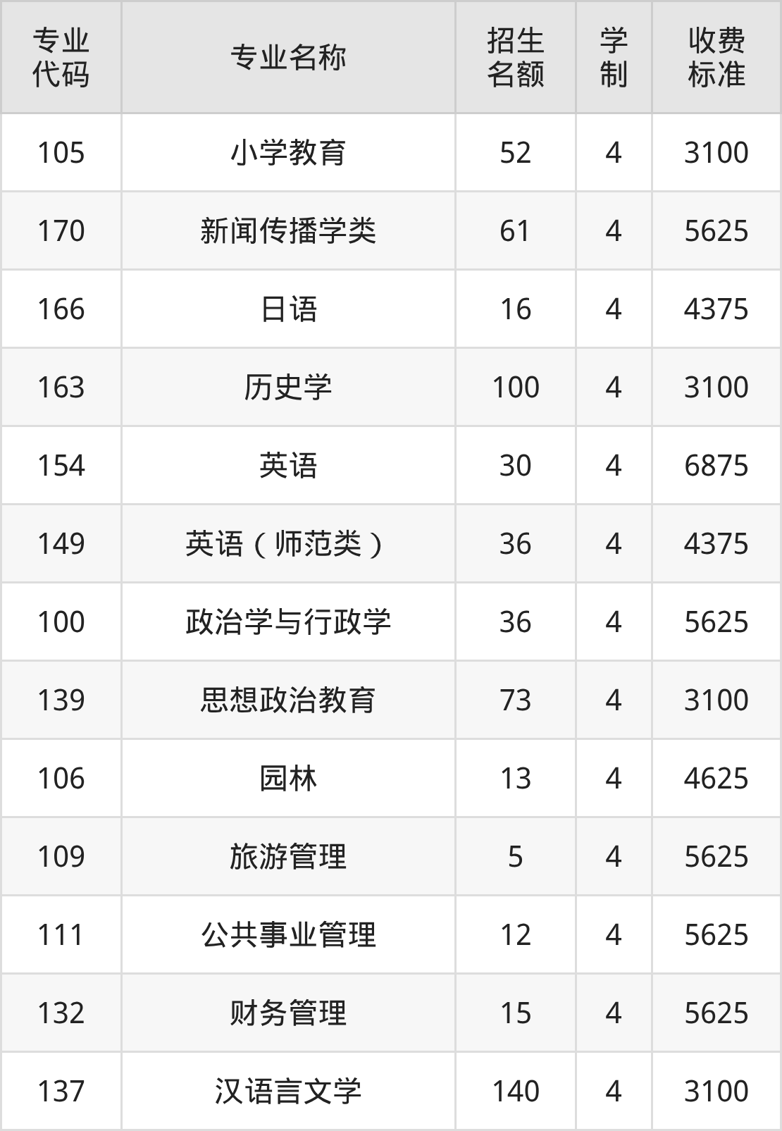 | 专业 代码 | 专业名称 | 招生 名额 | 学 制 | 收费 标准 |