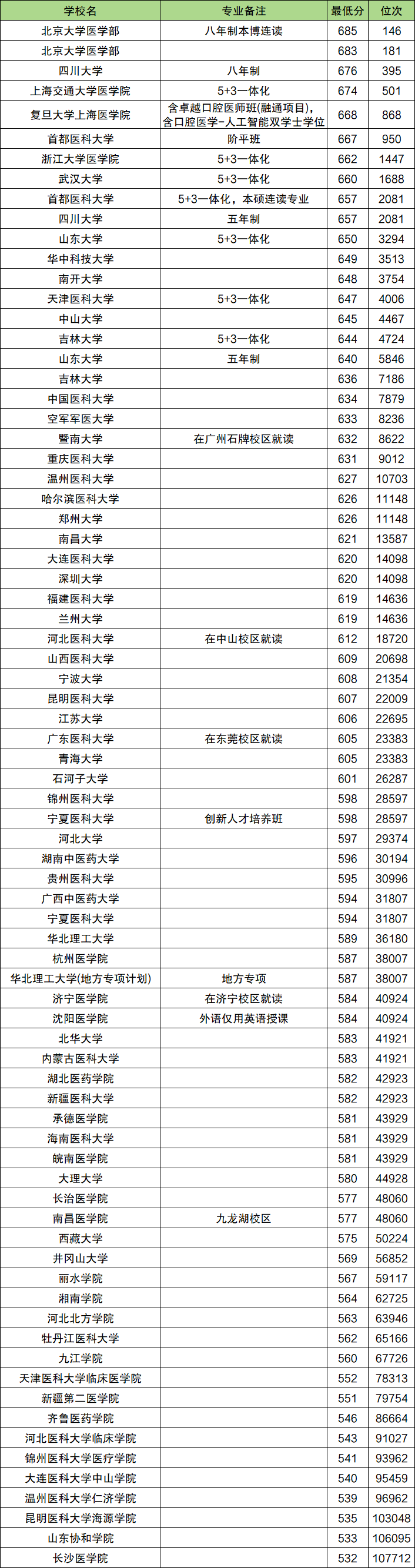 院校举例:北京大学医学部、中国医科大学、沈阳医学院、海军军医大学、南京医科大学、丽水学院、杭州医学院、安徽医科大学、厦门医学院等。