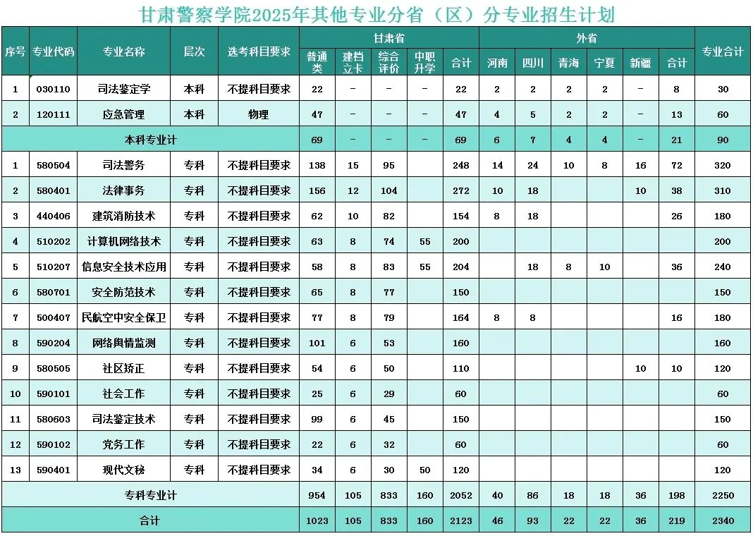 2025年招生计划2850名。申请公安专业的考生需参加2024年甘肃省普通高等学校招生全国统一考试,且必须具有甘肃省户籍。申请普通专业的考生,需要参加2024年甘肃、河南、四川、青海、宁夏、新疆等省(区)普通高等学校招生全国统一考试,且必须是高中毕业生。