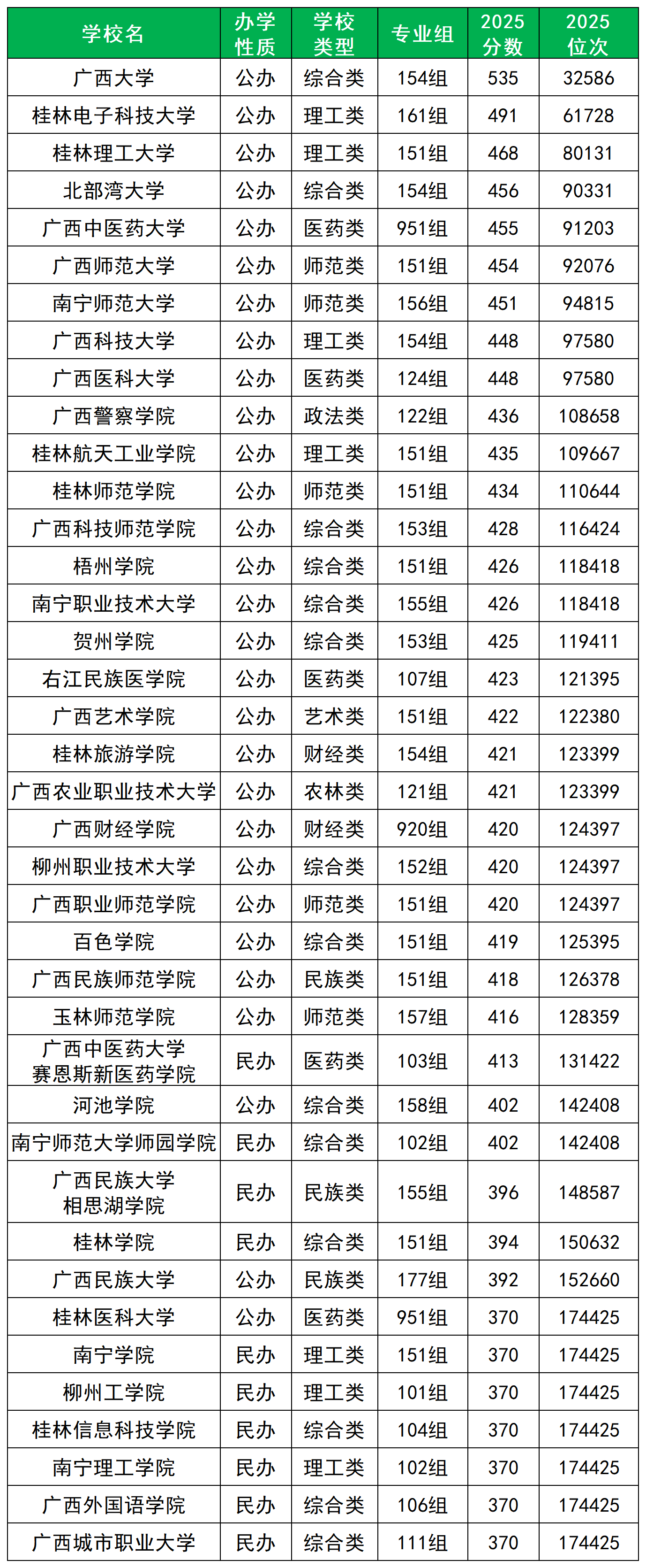 录取分数线最低的是桂林医科大学、南宁学院、柳州工学院等7所本科院校,分数线最低为370分,对应位次174425。