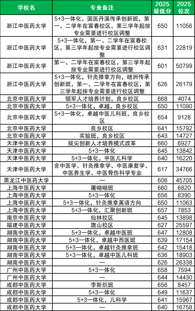 以浙江省招录数据为例,2025年中医学前十强院校最低录取分数线为601分,考生至少要在省排名50799名以内才有可能被中医学专业录取。