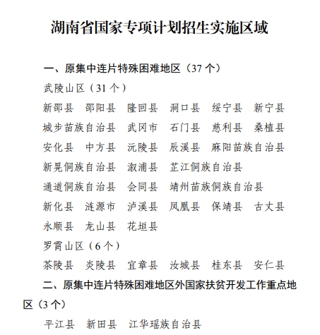 2026湖南国家专项计划实施区域涵盖40个县(市),包括武陵山区新邵县、邵阳县、隆回县;罗霄山区茶陵县、炎陵县等,具体实施区域名单如下:
