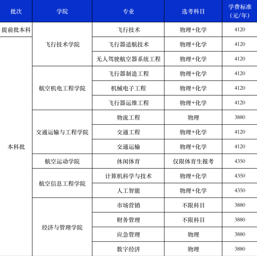 本科批招生专业:飞行器适航技术、无人驾驶航空器系统工程、飞行器制造工程、机械电子工程、飞行器运维工程、物流工程、交通工程、交通运输、休闲体育(仅在江西省招生)、计算机科学与技术、人工智能、市场营销、财务管理、应急管理、数字经济。