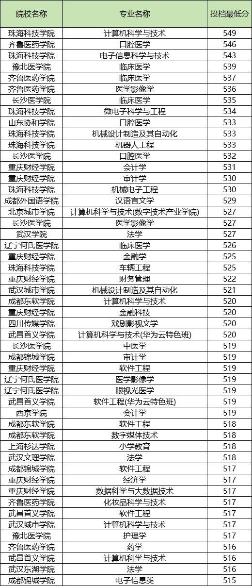 珠海科技学院549分、齐鲁医药学院546分、北京城市学院545分、武汉学院544分、武昌首义学院543分、珠海科技学院543分、重庆财经学院541分、豫北医学院539分、重庆财经学院538分