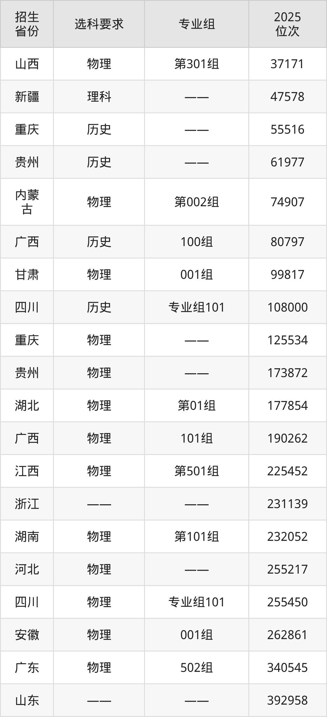 重庆化工职业学院2025年在全国各省的位次差异较大,最高位次是37171位(山西物理类)、最低位次是392958位(山东)。各省具体位次请看下图: