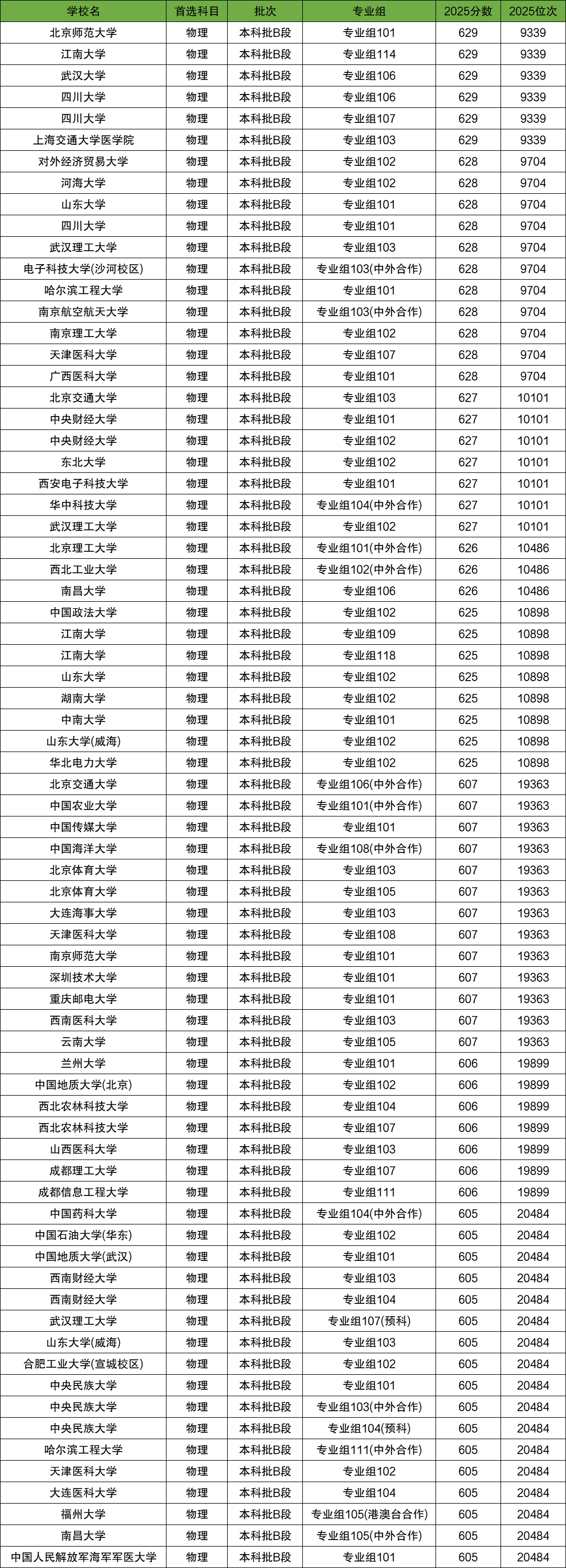物理类各层次最低位次大学: