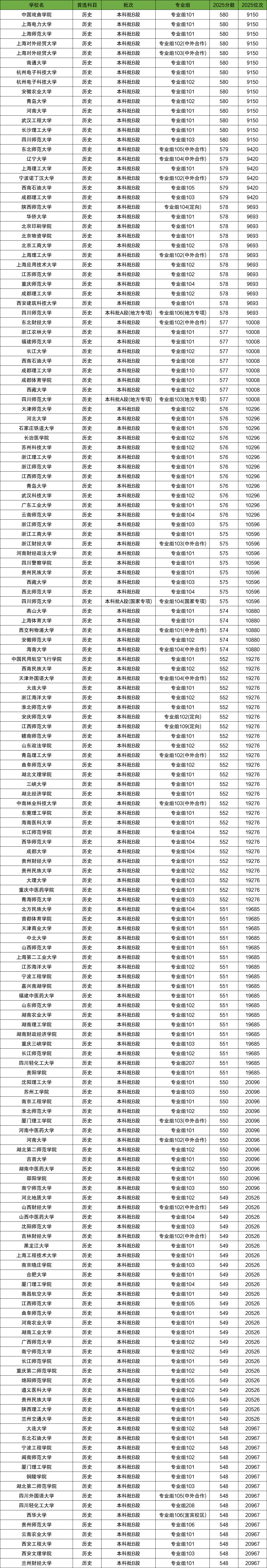 历史类各层次最低位次大学: