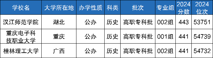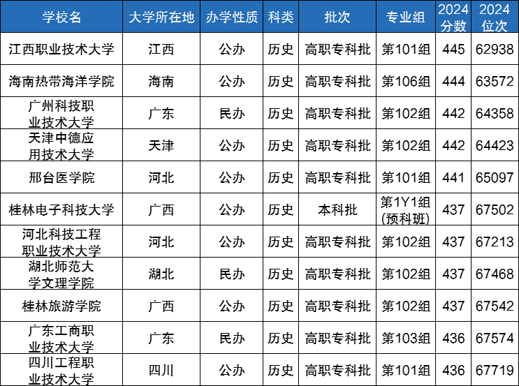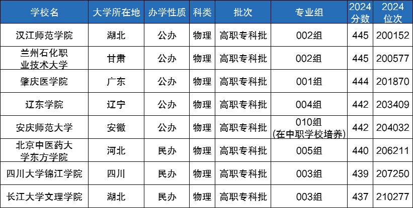 2024年安徽省的440分左右(435-445分)能上的本科大学一共有10所,均为高职专科批次录取的院校。
