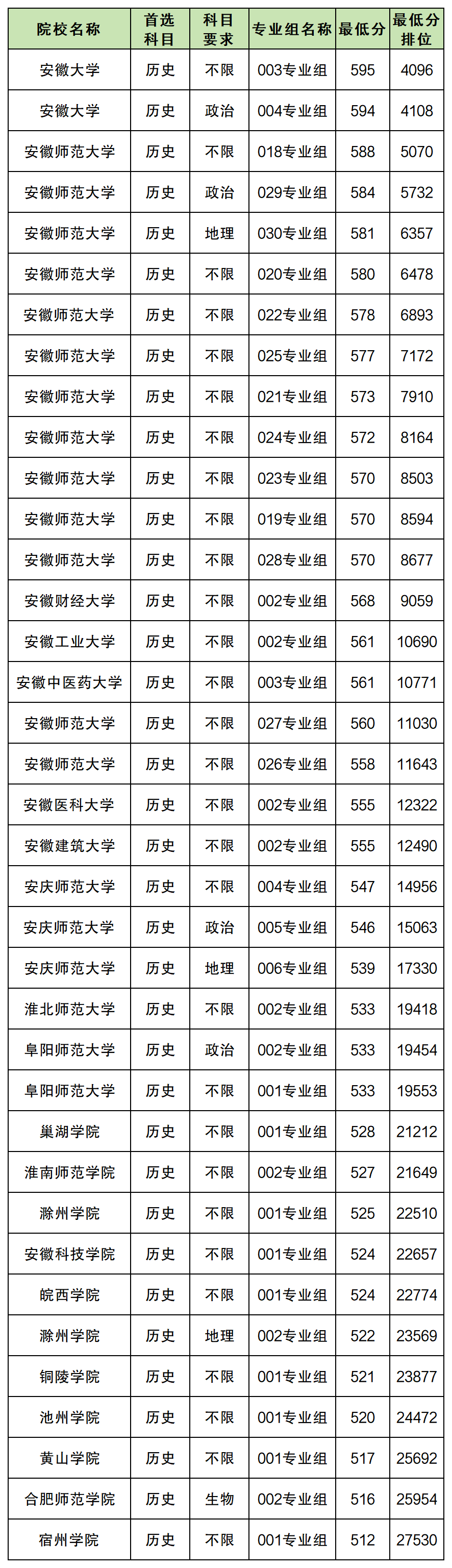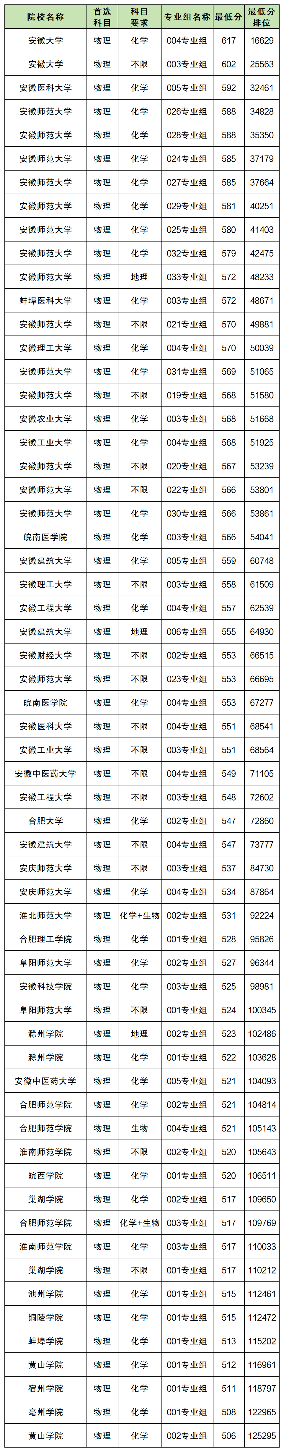 安徽师范大学(018专业组588分)、安徽师范大学(022专业组578分)、安徽师范大学(024专业组572分)等。