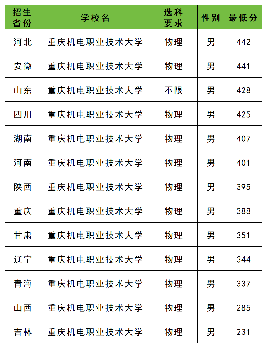 如2025年重庆机电职业技术大学在安徽省物理类招生最低分为441分。在河北省物理类招生最低分为442分。